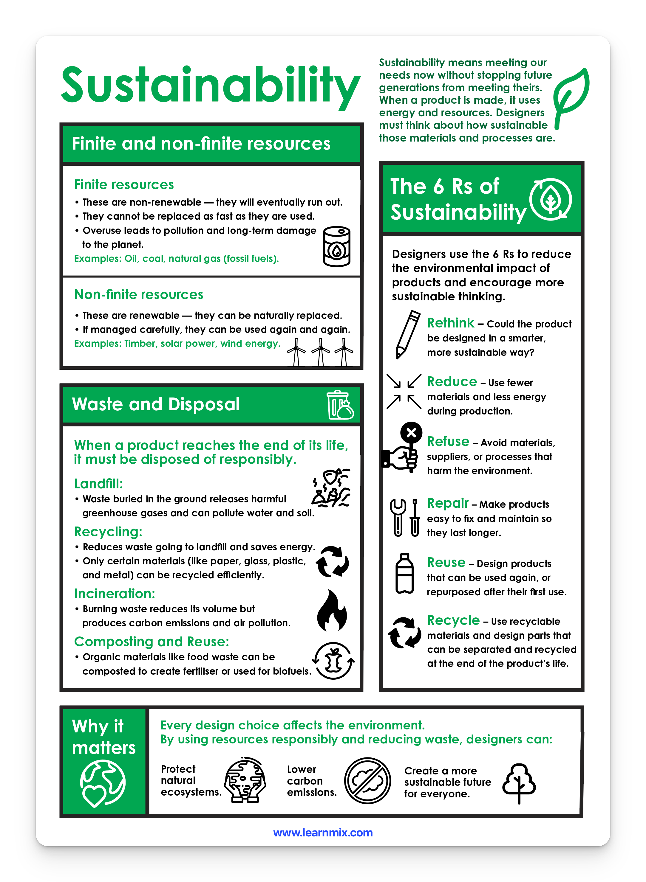 This accessible poster introduces students to the key ideas behind sustainability, including finite and non-finite resources, responsible waste management, and the 6 Rs of sustainable design. Clear explanations and visual prompts help learners understand how everyday choices affect the environment and how designers can reduce impact through smarter materials and processes. Ideal for design and technology classrooms, environmental studies, and cross-curricular displays.